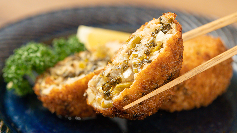 高菜とチーズを包んで揚げる。