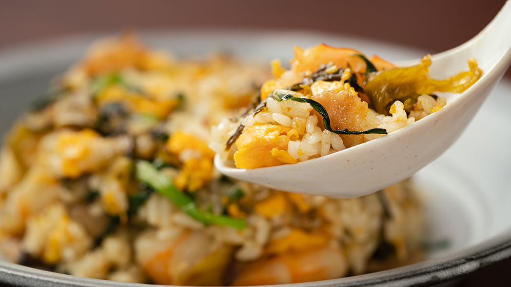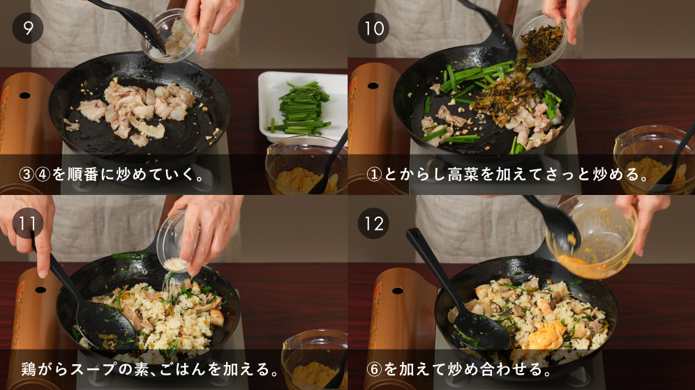 相性バツグンの豚肉と高菜。エビも入れてご馳走チャーハンに!